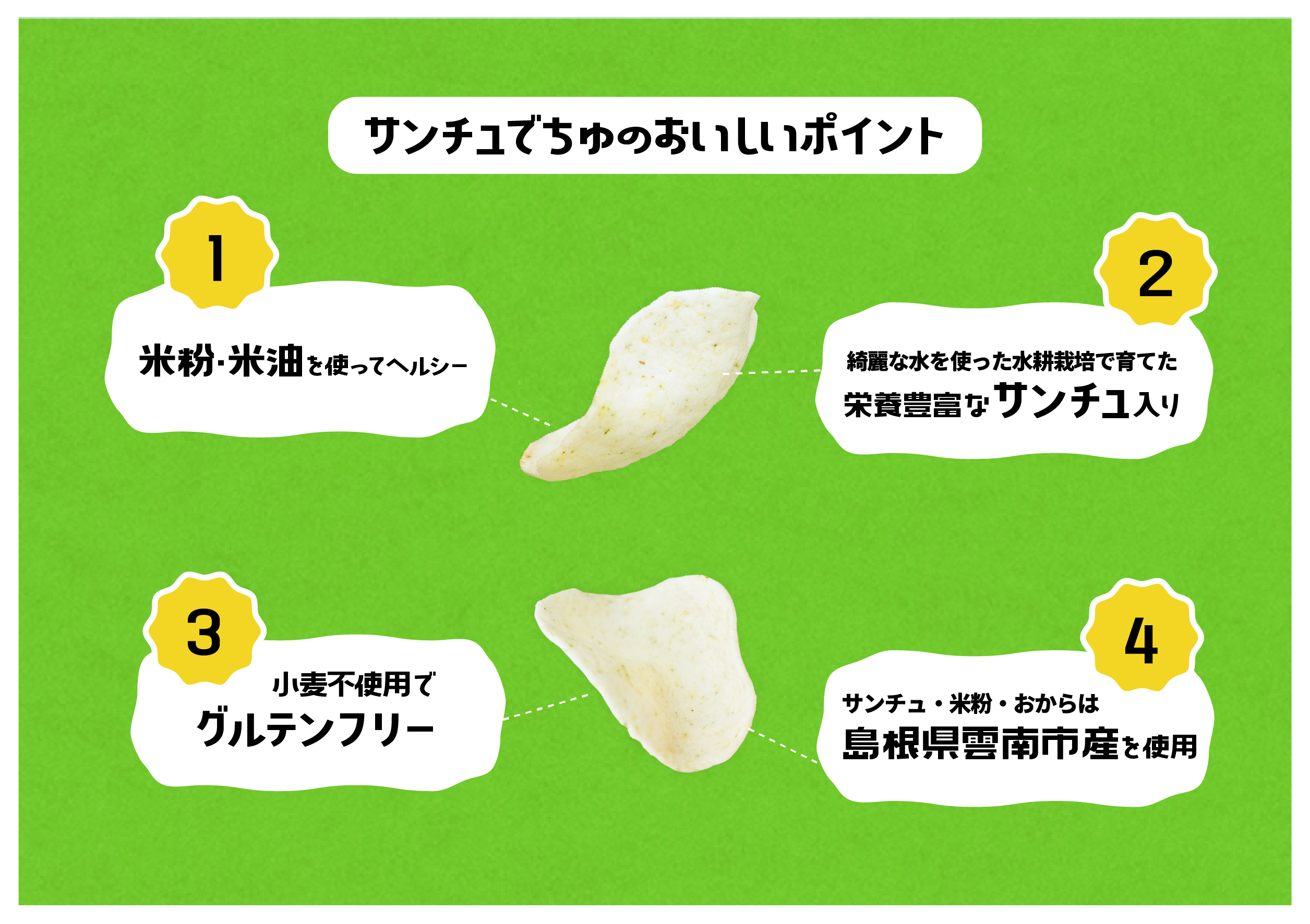 水耕栽培で作った雲南市産のサンチュを使い、おから/米粉/米油でヘルシーなスナック菓子を作りました。 本商品はうま塩味が4袋の販売となります。 <うま塩味> シンプルでやさしい塩味です。 大人の方はもちろん、小さいお子様もおやつとして召し上がっていただきます。 グルテンフリーなのでアレルギーをお持ちの方も安心してお楽しみいただけます。 <ピリ辛味> 雲南市さんの唐辛子を混ぜ、スパイシーな風味に仕上げました。 小腹が空いた時はもちろん、お酒のお供にもお楽しみいただけます。 ◾️商品内容:サンチュでちゅ うま塩味 4袋 ◾️内容量:50g/袋 ◾️賞味期限:製造日より約3ヶ月 ■発送時期:ご注文より1週間以内を目安に発送予定(製造の都合上、前後する場合がございます。)