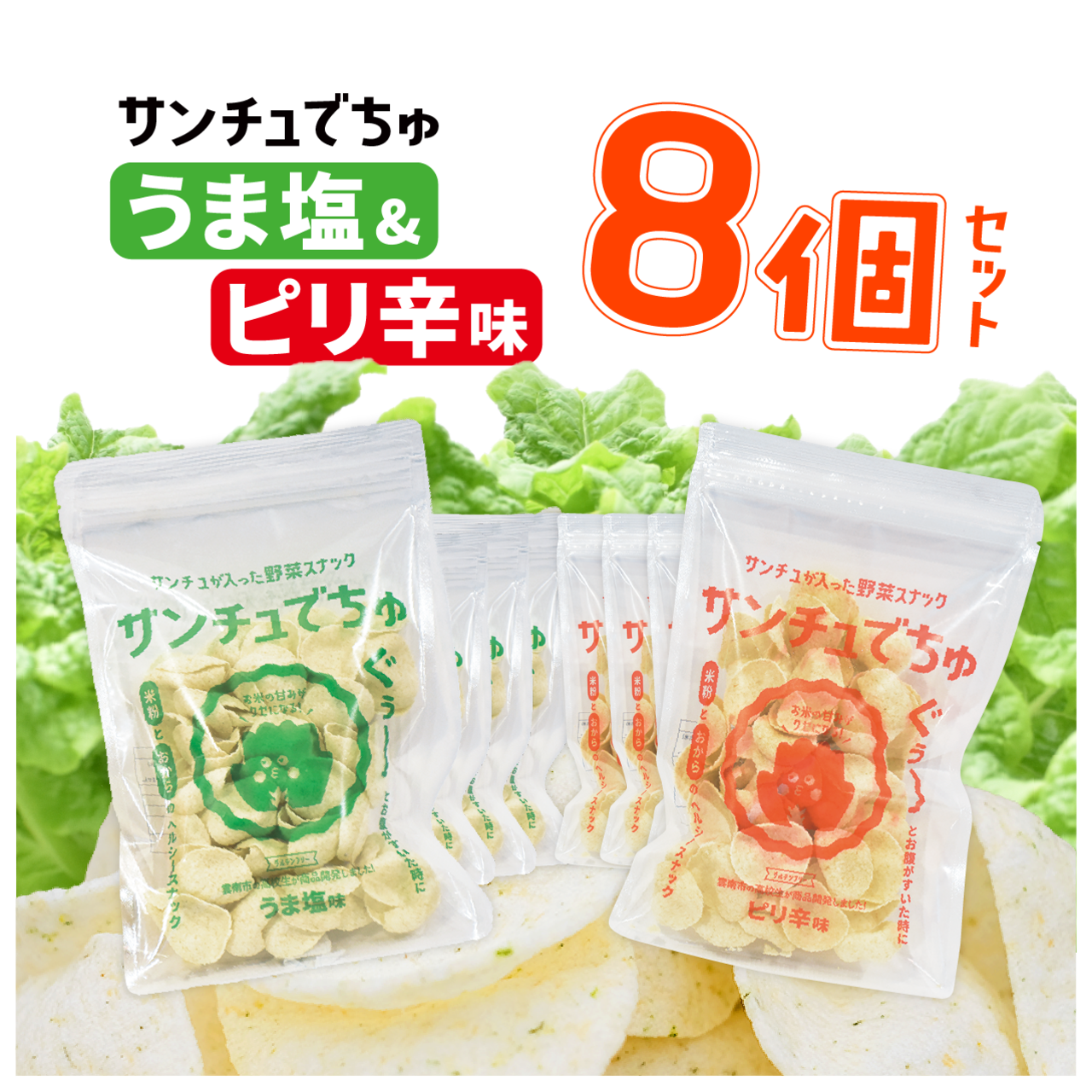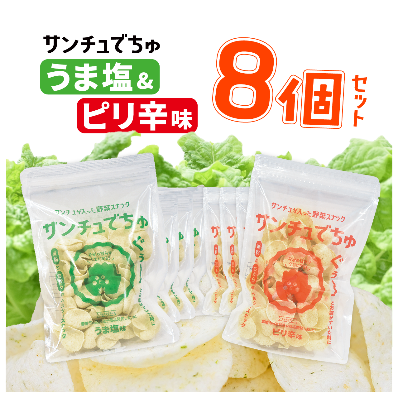 ◾️商品内容:サンチュでちゅ うま塩味 4袋、ピリ辛味 4袋